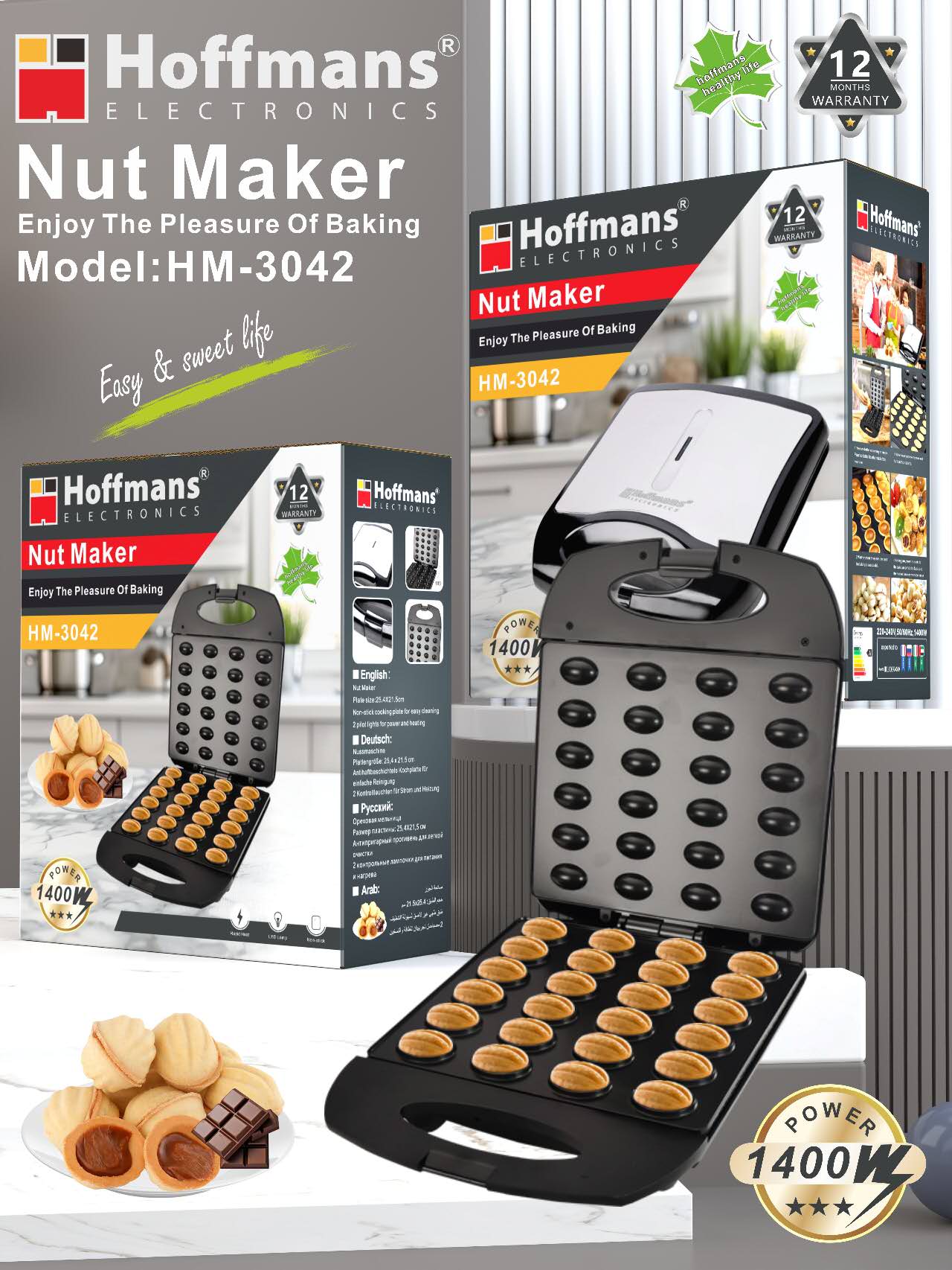 Aparatul HOFFMANS HM-3042 este ideal pentru prepararea celebrelor prăjituri tip nucă (oreshki), dar și pentru alte deserturi sau gustări dulci. Designul cu plăci duble asigură coacere uniformă, iar rezultatul este perfect de fiecare dată.